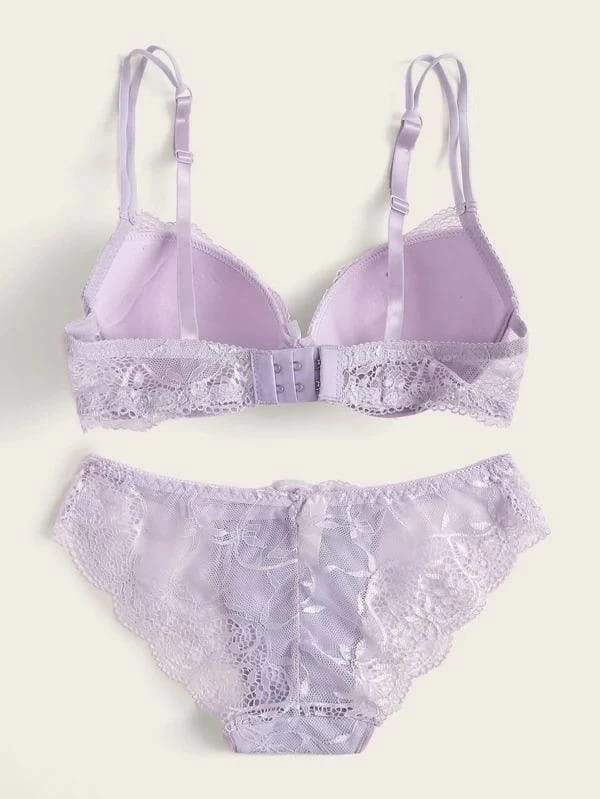 Style: SexyColor: Lilac PurplePattern Type: FloralBra Type: Push Up, UnderwirePanty Type: BriefsDetails: BowComposition: 5% Nylon, 80% Polyamide, 15% SpandexMaterial: LaceFabric: High StretchChest pad: No