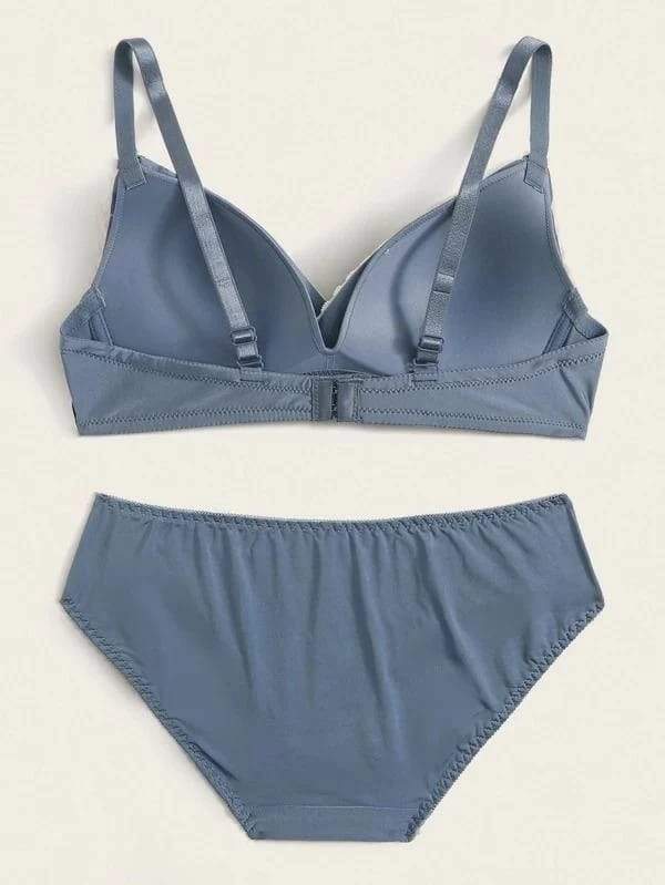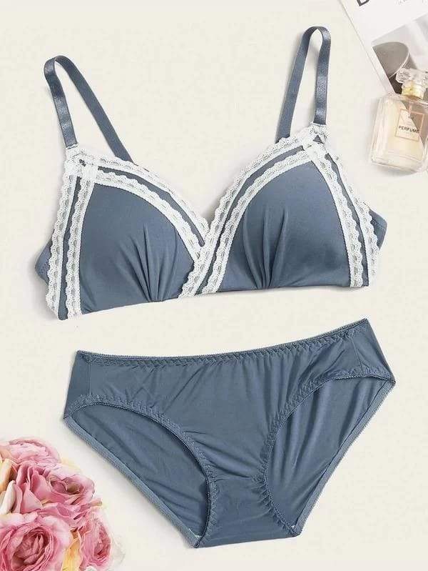 Style: ElegantColor: BluePattern Type: PlainBra Type: Full CupPanty Type: BriefsDetails: Contrast LaceComposition: 85% Polyamide, 15% SpandexMaterial: NylonFabric: Slight StretchChest pad: Yes,cann't be removed